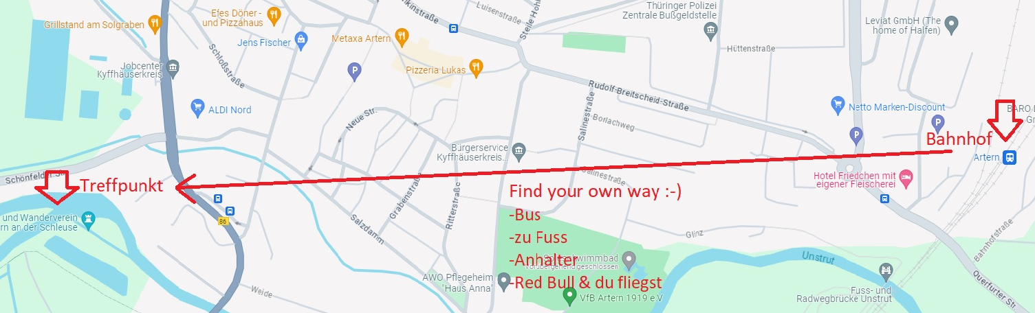 Wir treffen uns alle am Nachmittag/Abend auf dem Bootshausgelände des Kanu- und Wanderverein Artern e.V., An der Schleuse, 06556 Artern. Eine kleine Anfahrtsskizze inkl. Transportvorschläge findet ihr nochmal unter dem Punkt „Organisatorisches“.
