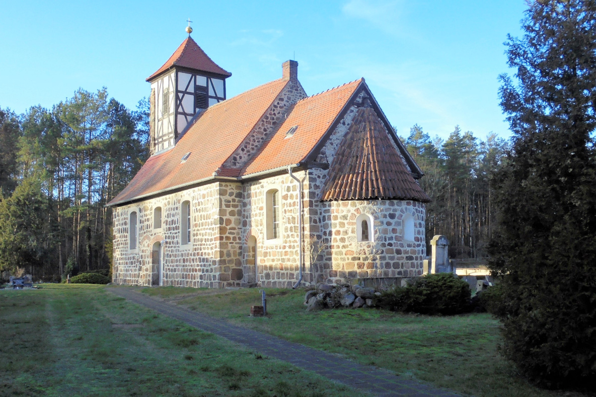 Wir steigen ab in das Tal des Grieboer Baches. Zwei ehemalige Wüstungen machen nur noch durch ihre Flurnamen auf sich ausmerksam, zunächst Knosdorf, später dann Dahlen­dorf, auch Dalau genannt. Im Gebiet eines Flächennatur­denk­males finden sich vielleicht noch einige Biberspuren; zumindest sehen wir, wie der Biber dort die Landschaft gestaltet hat. Möllensdorf erreichen wir dort, wo im Dezember stets der inzwischen weithin bekannte Waldweihnachtsmarkt stattfindet. Im Dorf entdecken wir noch einen restaurierten Ziehbrunnen. Nach einer kurzen Besichtigung der spätromanischen Feldstein-Flämingkirche in Möllensdorf verlassen wir das Dorf auf dem Weg in Richtung Wahlsdorf.
