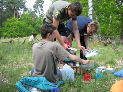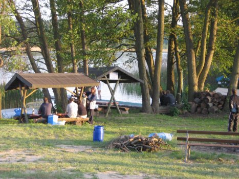 Der nächste Morgen erstrahlte dagegen in herrlichstem Sonnenschein und alles deutete darauf hin, dass es ein schöner Tag werden würde. So paddelten wir denn auch gleich auf dem nun spiegelglatten Stolpsee zurück bis zum Havelkanal und weiter bis Bredereiche. Hier gab es eine schöne, typisch märkische Fachwerkkirche von 1689 zu besichtigen. Neben Barockaltar und einem handausgepreisten Kerzenständer aus dem 17. Jahrhundert, gab es noch Zeugen der hier 1839 gegründeten Schifferinnung zu sehen, in der Form, dass die 16-jährigen Mädchen, welche zum ersten Mal zum Tanz gehen durften, diesen Umstand mittels einer handbestickten Scherpe feierten... Mittlerweile gibt es aber sowohl die Schifferinnung nicht mehr als auch die Scherpen. Gut gestärkt nach einem opulenten Mahl fuhren wir weiter bis zu unserem Nachtquartier an der Schleuse Regow. Hier befand sich auch eine Ziegenkäserei samt angrenzendem Biwakplatz, auf welchem wir uns für die Nacht niederließen... Vorher wurde aber noch fachmännisch ein Lagerfeuer gezaubert, Wurst, Käse und Brot vergrillt, Gitarre und Mundharmonika gezückt und die letzten Liedtextkenntnisse zum Besten gegeben. Ein Biber wurde beim Abendmahl entdeckt und zu späterer Stunde breitete sich ein wunderbarer Sternenhimmel aus...