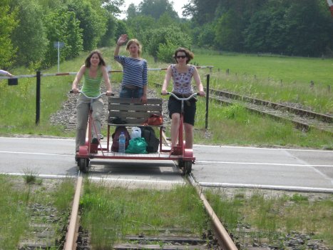 Unseren letzten Tag widmeten wir mal nicht – wie sonst üblich – dem Paddeln, sondern dieses Mal der Fahrraddraisine auf dem Weg zurück von Templin nach Fürstenberg. Diese gibt es dort seit 1996, die Strecke ist ca. 30 km lang und befindet sich auf den Schienen der ehemaligen Zugverbindung zwischen Templin und Fürstenberg. Das war natürlich ein Abenteuer, denn kaum jemand hatte das dort schon einmal erlebt. So konnten wir die durchpaddelte Seenlandschaft durch Uckermark und Oberhavel noch einmal aus einer etwas anderen Perspektive Revue passieren lassen… Es gab einige Stellen zum Rasten und Natur genießen und auch einen kleinen Ausflug zu der Fachwerkkirche Kirchlein im Grünen