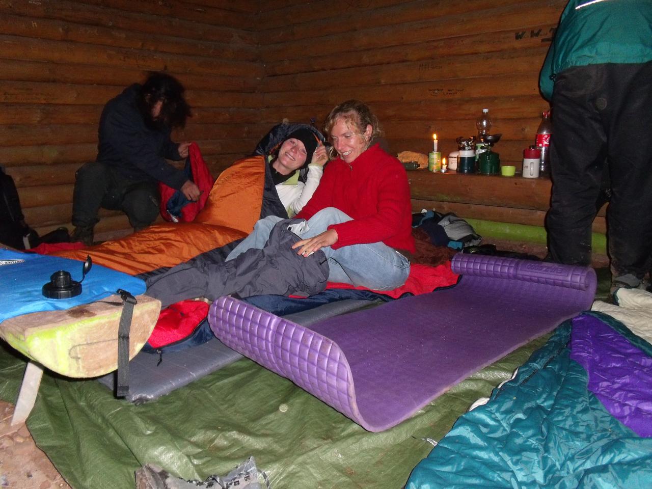 Jetzt war es soweit. Der Aufstieg kann beginnen. Man mag es kaum glauben, wir erzählten und erzählten und erzählten und plötzlich, huch, sind wir in den ersten Metern schon vom Weg abgekommen. Aber für erfahrene Wanderer kein Problem. Nach ca. 1,5 km erreichten wir die erste Hütte. Nach einer kurzen Überlegungspause war klar, wir gehen weiter bis zur nächsten. Was wir heute noch schaffen, müssen wir morgen weniger laufen. Die Dunkelheit überraschte uns sehr schnell. Am Flüchtigen Hirsch angekommen, bauten wir unser Nachtlager auf. Eng aneinander gekuschelt saßen wir dann alle Vier in der Hütte. Trotz der Kälte und Feuchtigkeit war die gute Laune in der ganzen Hütte zu spüren.