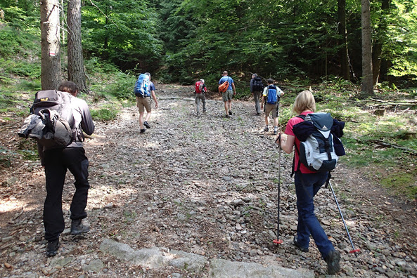 Ab jetzt ging’s aufwärts. Der Tageshöhepunkt hieß „Töpfer“ auf 582 Metern Höhe. Der Weg dahin ließ auch den letzten merken, daß das keine Spaßwanderung wird, sondern ganz schön sportlich. Oben angekommen und den Kamm langmarschiert boten sich herrliche sommerliche Blicke auf die Landschaft des Zittauer und des Isar-Gebirges. Am Abend fanden wir in Jonsdorf eine sehr schöne Herberge vor und – vor allem – wurden wir mit frischem Grillgut kulinarisch verwöhnt und gestärkt. So klang ein herrlicher Sommerabend bei einem netten Feuerchen aus.