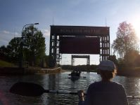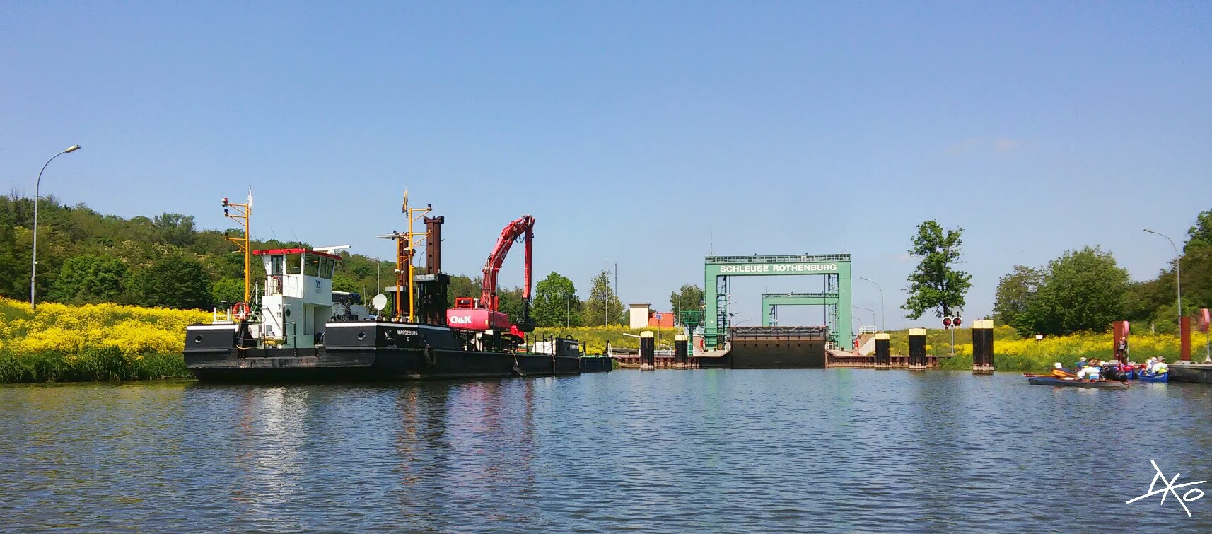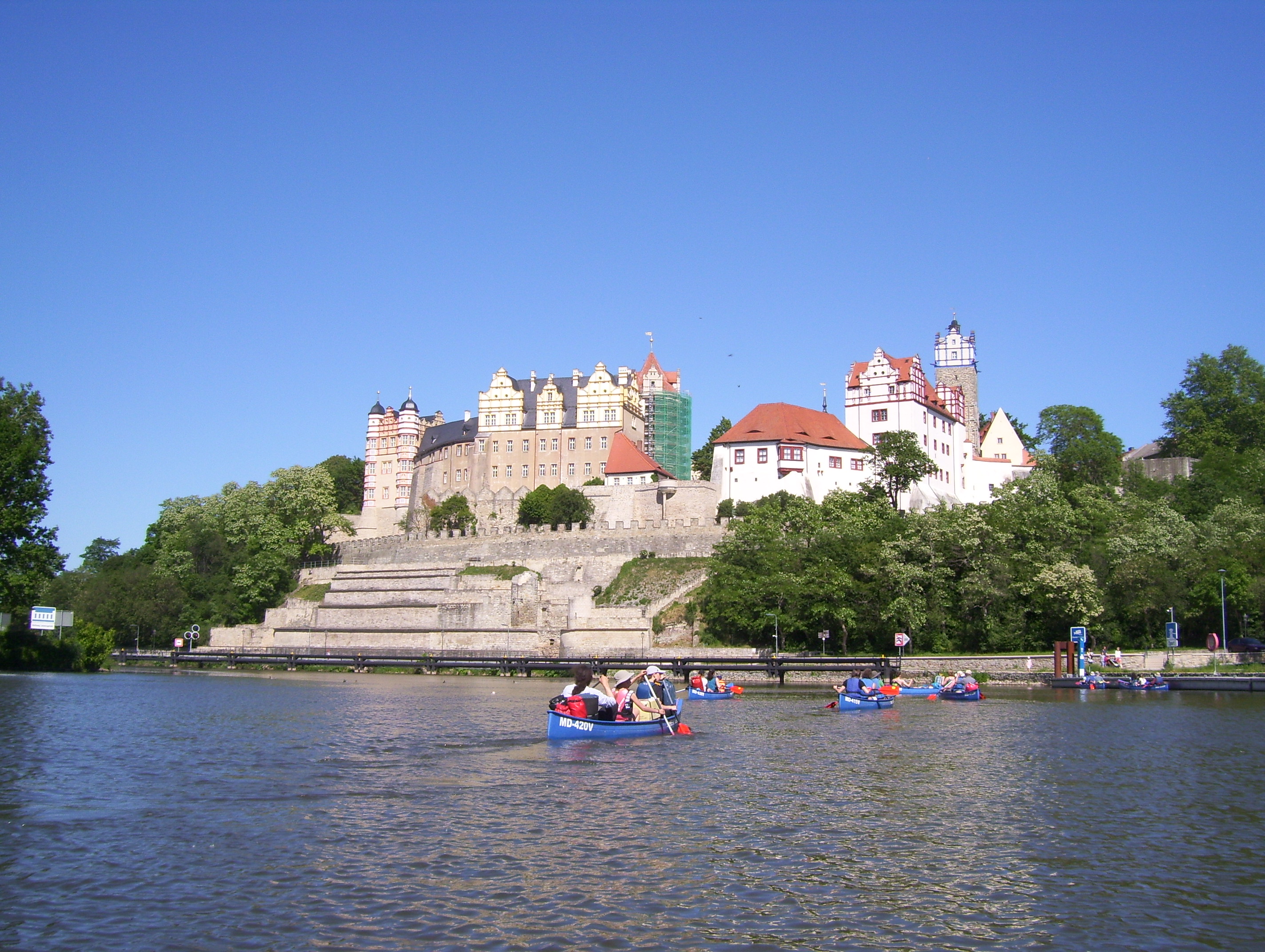 Freitagvormittag, nach dem gemeinsamen Frühstück, ging es weiter. Immer der Strömung nach, bis uns die Schleuse Rothenburg stoppte. Imposant rahmt sie die Saale. Mit schwerem Stahltor reguliert die Schleuse den Wasserpegel und wir mitten drin, da hieß es: festhalten! Zeit zum Beine-Vertreten hatten wir in Als­leben. Dort konnte, wer wollte, sich mit Verpflegung für die kommenden zwei Tage eindecken. Weiter ging es entlang einzigartiger Natur­landschaften, sattem Grün und munterer Schafe. Am Abend erreich­ten wir unseren Zeltplatz, beim Bern­burger Maritimen Club.