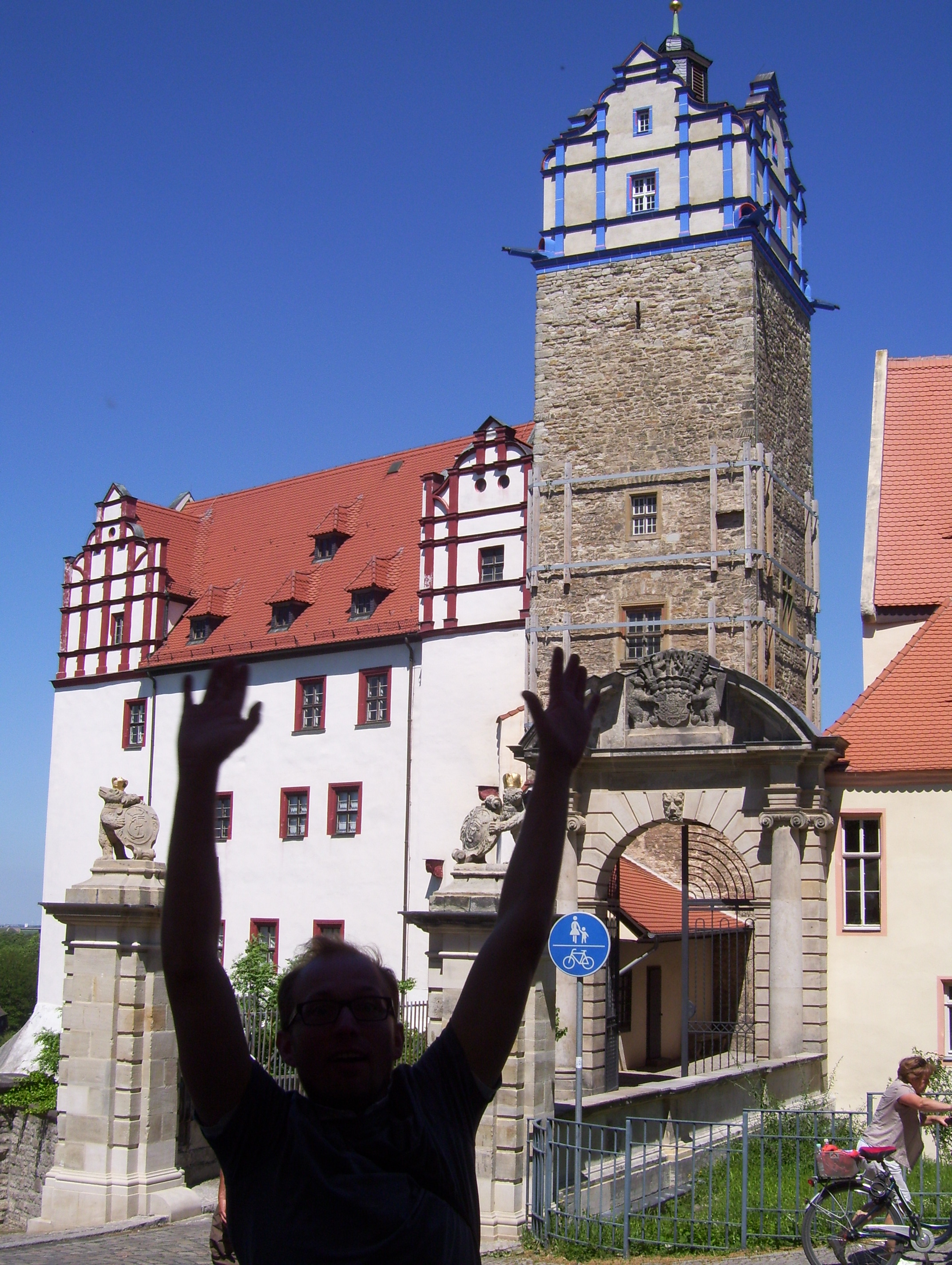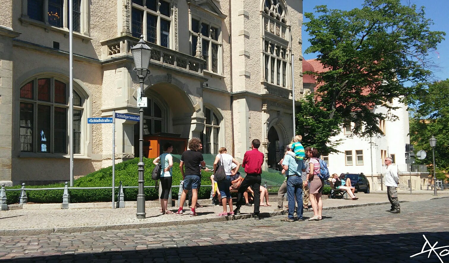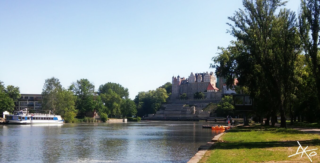 Am Samstagvormittag nach dem gemütlichen Frühstück brachen wir auf. Diesmal aber zu Fuß, denn Osama führte uns durch Bernburg und begeisterte uns mit Erzählungen und Fakten. Mit der Fähre setzen wir auf die andere Seite der Saale über und flanierten am Bernburger Theater und Schloss vorbei und lauschten interessiert den Ge­schichten von Osama.