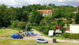 Nächster Stopp war Wettin, wo eine kurze Stadtbesichtigung auf dem Programm stand. Wettin liegt am Steilhang der Saale. Von der Anhöhe hatten wir einen tollen Blick auf das Untere Saaletal. Das Untere Saaletal ist ein Naturpark, der sich im Ortsgebiet Wettin über Täler und Hügel rund um die Burg Wettin erstreckt. Am Abend erreichten wir unseren ersten Campingplatz namens Saaletal in Koschwitz. Eine wunderschöne Abendstimmung lullte uns in den Schlaf.