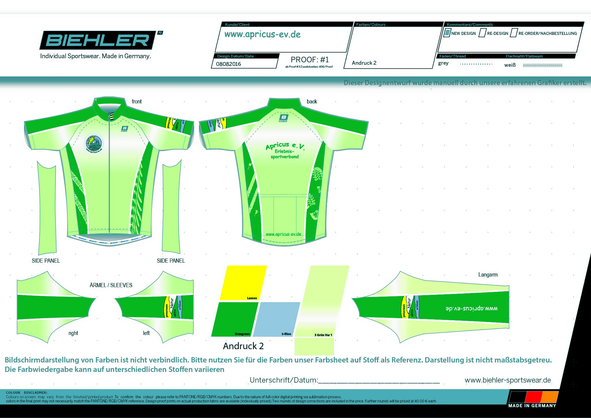 Das Design wurde ursprünglich mit dem Hersteller "Biehler" aus Limbach-Oberfrohna entwickelt und die ersten Interessenten wurden bereits mit einem Trikot versorgt. Nebenstehend könnt ihr das Design begutachten - die Farben wirken am Monitor jedoch etwas anders als auf bedrucktem Stoff. Sie wurden aber direkt durch Druckproben auf dem Material auf unsere Apricus-Farben abgestimmt. Wer eine aktuelle Visitenkarte zur Verfügung hat, der findet v.a. den dunkleren Grünton und das Gelb genau wieder. Das hellere Grün und das Blau sind sehr nah dran, aber etwas kräftiger.